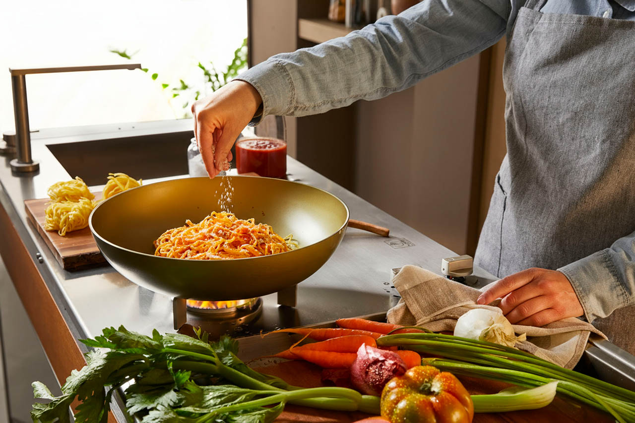 Un’area professionale dedicata, pronta ad accogliere chef o food stylist per preparazioni in tempo reale, ottimizzando tempi e risultati.